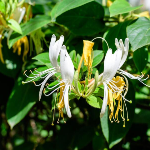 特点: 芳香爬藤植物, 四季长青, 花初开为白色,后转为黄色,因此得名金银花。喜欢太阳, 耐旱抗晒, 生长速度快.